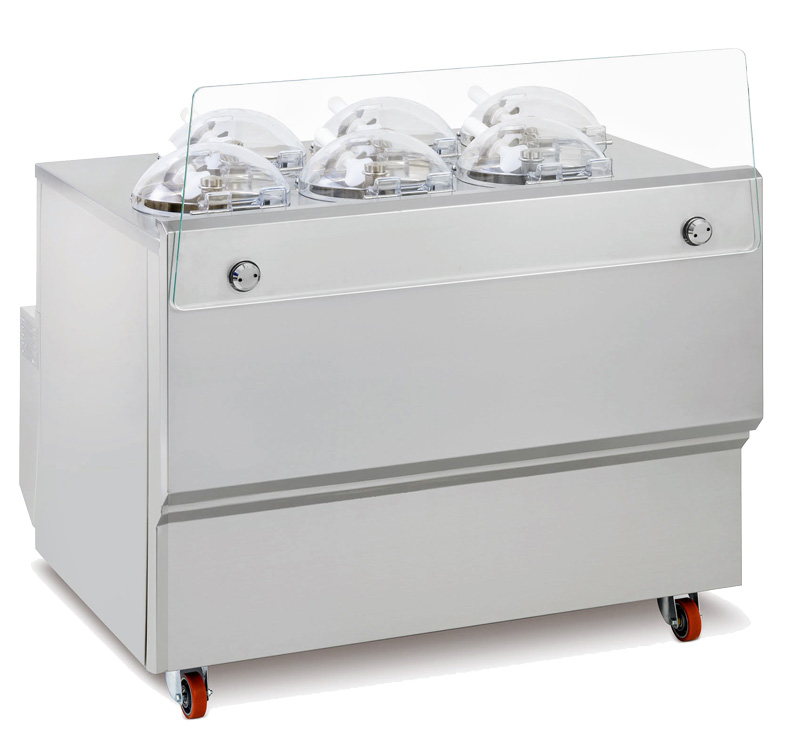 Unikátní výrobek značky FRIGOMAT, kombinace prodejní vitríny s výrobníky zmrzliny. Vyrobte si čerstvou zmrzlinu a rovnou ji prodávejte. Přímo z výrobníků zmrzliny můžete zmrzlinu distribuovat. Každý zákazník uvidí přípravu své kvalitní a lahodné zmrzliny
